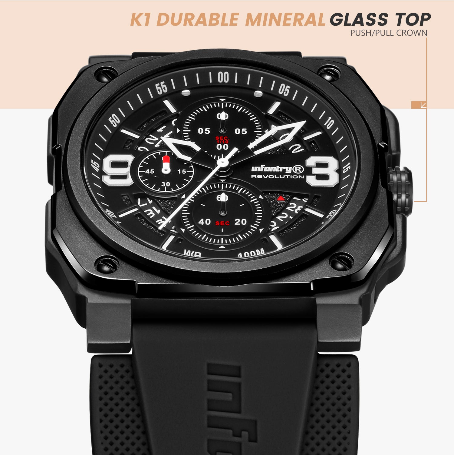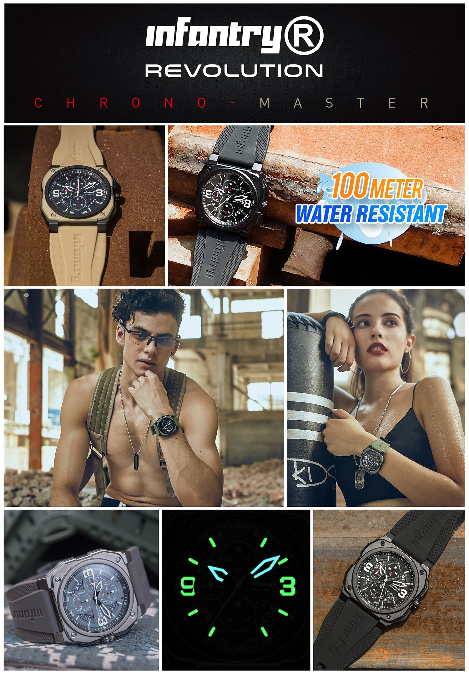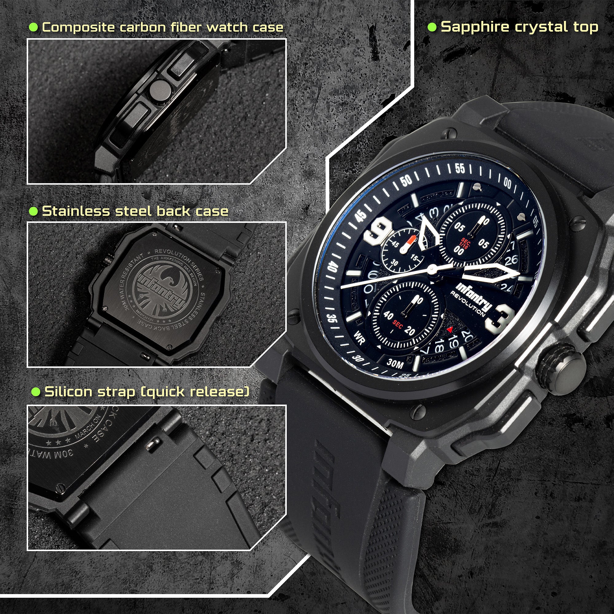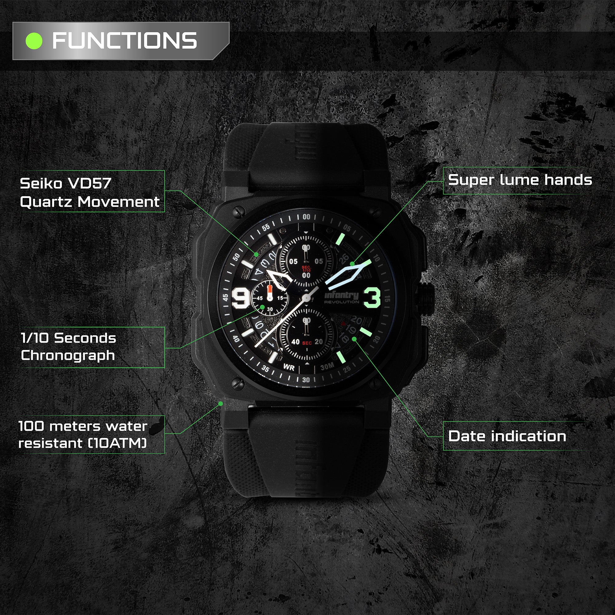 Inspired by military heritage and designed for extreme durability, these watches are water-resistant up to 100 meters, making them perfect for both urban jungles and untamed wilderness. Featuring precision Seiko VD57 quartz movement and robust composite carbon fiber cases, these chronograph watches offer 1/10 seconds chronograph, date indication, and timeless style. Ideal for those seeking a reliable, fashionable timepiece for any adventure.